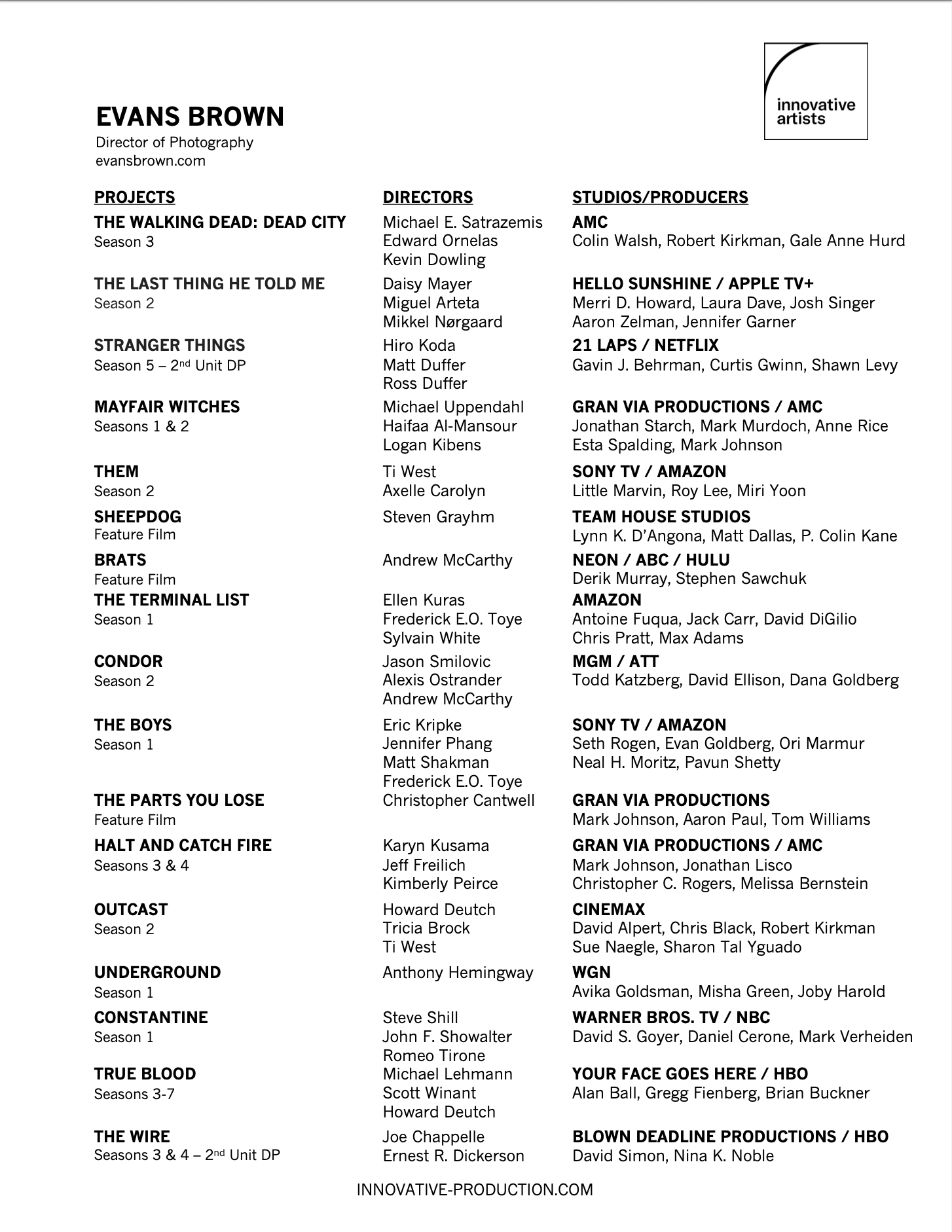 Evans Brown was born and raised in Indianapolis, IN. Evans’ father was a Mechanical Engineer and photographer, his mother a lower elementary educator and fine art painter. He is also the proud co-parent and father of two sons Parker (14) and Logan (12) who are killer snowboarders. If Evans is not on set he is with his sons on the mountain. Evans followed the creative path initiated by his parents and attended The School of the Museum of Fine Arts in Boston for college, where he studied fine art black-and-white photography and filmmaking. After college Evans began working on films as a Director of Photography and Chief Lighting Technician. Evans continues to study the art of black and white photography focusing on the human condition as his father did. Evans has always been a lover of the photographic image as it relates to light. Going on photographic expeditions with his Father where he was instructed to call out “Pull over I see a picture!” Then his father would instruct him on composition, light, and a way of seeing he carries with him today. Evans’ career spans a variety of content, and after 20 career as a gaffer his career shifted landing him as a Cinematographer on productions like HBO’s “The Wire” and “True Blood,” as well as NBC’s “Constantine,” VH-1’s “The Breaks,” AMC’s “Halt and Catch Fire,” and Cinemax’s “Outcast.” Most recently, he worked on the Toronto based Amazon series called “The Boys” Evans favorate genre is spy thrillers. Instead of returning for Season Two of "The Boys," an opportunity arose to work with Adam McCarthy (Producing Director) on a remake of the series "Three Days of the Condor," a Series called “Condor” Most recent work includes the spy thriller "The Last Thing He Told Me" with Jennifer Garner. It was one of Evans' life goals to start and build a successful business. This opportunity arose while working on the HBO series *True Blood*, where Evans and his soon-to-be partners began formulating and designing plans for a company called Quasar Science, LLC an LED Technology and Logistics Company specializing in the design and high color rendering of LED lighting products. Evans responsibility at Quasar forms a wide range from product development to strategy, with a focus on the diversification of the company. This unique experience of starting a business has given Evans an appreciation for the products he is involved in making as a filmmaker building a new respect for producers and Studio Executives on a business level and an understanding of his responsibility to complete the day in a timely fiscally responsible manner.