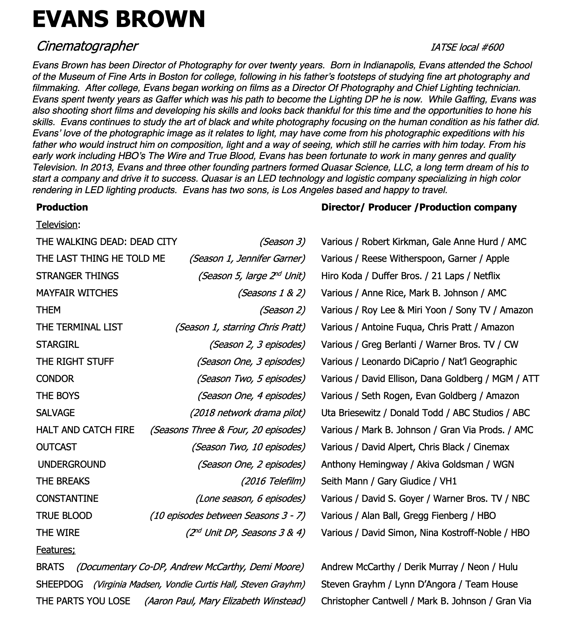 Evans Brown was born and raised in Indianapolis, IN. Evans’ father was a Mechanical Engineer and photographer, his mother a lower elementary educator and fine art painter. Evans followed the creative path initiated by his parents and attended The School of the Museum of Fine Arts in Boston for college, studying fine art black and white photography, and filmmaking. After college Evans began working on films as a Director of Photography and Chief Lighting Technician. Evans continues to study the art of black and white photography focusing on the human condition as his father did. Evans is married and started his family later in life at 44 years of age. His wife Tachou and him have two wonderful young boys 5 and 7 years old, family being the life-blood that makes the world right. Evans has always been a lover of the photographic image as it relates to light. Going on photographic expeditions with his Father where he was instructed to call out “Pull over I see a picture!” Then his father would instruct him on composition, light, and a way of seeing he carries with him today. Evans’ career spans a variety of content, and after 20 years of being a gaffer his career shifted landing him as a Cinematographer on productions like HBO’s “The Wire” and “True Blood” as well as NBC’s “Constantine”, VH-1’s “The Breaks”, AMC’s, “Halt and Catch Fire”, Cinemax’s “Outcast”, and as of recent the Toronto based Amazon series called “The Boys” and the now shooting the spy series “Condor” It has been a life goal of Evans to start and build a successful business. This opportunity came while working on the HBO series True Blood where Evans and his soon to be partners started formulating and designing plans on what is now Quasar Science, LLC an LED Technology and Logistic Company, specializing in the design and high color rendering of LED lighting products. Evans responsibility at Quasar forms a wide range from product development to strategy, with a focus on the diversification of the company.